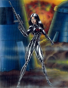 This cutout was one of the first times I'd drawn the Baroness in quite a while. I was trying to avoid making her look like some super-powered character, but only succeeded in making her look too danged thin. If you look at a lot of the G.I.JOE cutouts I did of this era, many of them share that same flaw. I'm not sure, but I think the cutout itself was drawn in 1999.