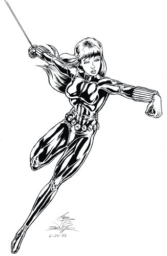 Another pic from when I was trying to get both my drawing speed and art mojo back again. My main mistake here was that I started drawing a more exciting action pose, but then tried to get 'realistic' with it. That pretty much ruined the pose right there. On the plus, I got the shiny black outfit looking close to the way that I wanted it to look. I'm pretty sure that I could get this pose just right if I did it again... which I probably will.