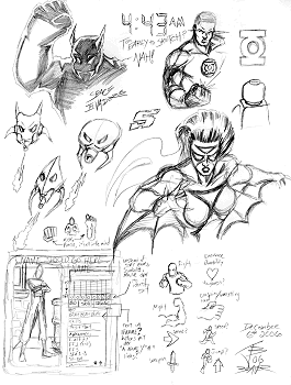 I'm trying to get back into the habit of kicking out whatever's in my head onto a piece of paper and that's all this was. I did this after I got back from work and, well, you can pretty much tell, can't you? Space Invaders = Taito Legends compilation for Playstation 2, Spider-Woman = Essential Spider-Woman vol. 1, and the partial Lego minifig was from how there's a few next to the bed. The John Stewart GL was in my head due to the recent death of DC animation composer Shirley Walker (R.I.P.). At the bottom is a concept sketch for ScrollBoss' character profile layout which appear on this site for my characters, too. If you squint, you can see some of the button functions and such. It's nice to have this stuff on paper instead of cluttering up my brain where it can be easily forgotten.