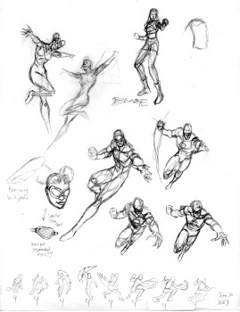 Just messing around and thinking of drawing DC's Bumblebee in a custom outfit that blend her comic book and cartoon designs (because I like drawing afro puffs). Then I started thinking of Bumblebee (Teen Titans) and Wasp flying around together in the same pic and sketched that. That may make it to real pic status one day. There's four different takes of a Green Lantern pic that I was thinking of starting from the upper left hand one (side view) and counter-clockwise to the one with the light trail. The female fighter in the corner is Blaze Fielding from Sega's Streets of Rage and that's an alternate view of her SoR2 fighting stance. Yeah, you'll be seeing that drawn full size pretty soon. If you're a fan of the SoR series, then you probably noticed that those numbered lil' cave drawings at the bottom look like Axel Stone's Dragon Wing attack. Well, it is. I was working on an animated gif of the sprites and just decided to lightly sketch each frame and how long it's displayed. I've done it before, but not on a doodle page. Looking at it now, it seems like good animation practice.