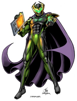 Erziver, earlier seen as Ervizer, needed a better profile pic than the one I did in 2007. The changes are minor but may be just what he needed. The picture looks a bit crooked, it's probably because I sick when I drew it. I gave him the purple and green colors because, as everyone knows, that color combo is usually a clue to EVIL. One the gist of this character is revealed in the story the rest of his outfit design becomes even more obvious.