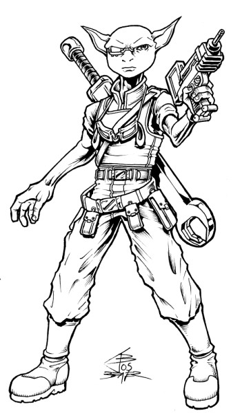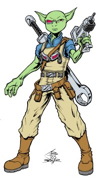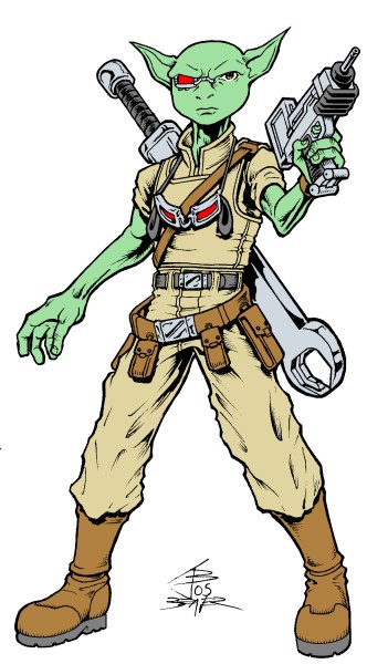 The Gremlin here is an old character of mine from the 80's that is second only to Twofold in overall redesigns. His redesigns even changed him to a bulkier character for a while before returning to his wirey roots. This current version is based on the idea I had around 1999 or 2000 where some of his people crashed-landed on Earth before WWII, were captured by Nazis and forced into their super-science collective to create advanced weapons. The 'gremlins' used their own tools to rebel and joined the Allies to help fight the Nazis. They returned to their home planet and Gremlin here is the grandchild of that ship's main engineer. He grew up hearing stories about Earth heroes and learned his granddad's Earth-based fighting style that uses modified versions of their tools. After getting a more powerful computer, I went back to the original scan and did a bit more line clean-up so I can color a larger, nicer version. I also added the blue shirt since that sets everything off perfectly. This will probably be the outfit that you see him wearing in his first story appearance and will include that pair of his late grandfather's goggles he wears around his neck.