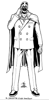 I barely have any villains designed for the "Earlier Age" of events that happen in this comic book universe but the Inquisitor is easily the most important. His image, intentionally weird even by his own design in the books, will turn up in flashbacks but his influence will be wider than anyone will ever expect. The older designs were much like this except his older names, Questionnaire and Quizmaster, meant that there was no letter I on his mask.