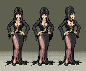 2014: The first sprites and portrait were made for the first DangerTerrorHorrorThon horror and monster-themed update of ScrollBoss in 2014. The main Elvira pose was based on a reference pic that I found a while ago, but can't find online now. I partially tried to match the Street Fighter Alpha 3 Vs. portrait style (mainly the face positioning, head shape and nose) while trying to still make it look a bit like Elvira. I tried to work in the smirk from on a site wallpaper here. I was trying to make her look sly and smart, but she wound up looking more cute than I intended. Honestly, Elvira is as fun to draw and sprite as she is to watch in hosting duties or in her own movies, so don't be surprised if I add more to this.