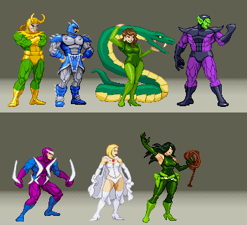 Loki and the Mandarin were made for the Avegners-themed update for ScrollBoss that was made around the same time Avengers hit theaters in 2012. Princess Python was quickly made for the Saturday Night Sprite topic on the Scruffy Dragon message boards in 2012 (before the site and board was rebooted), but fixed up a bit later. I've tried a few times to put scales on the light green part of the outfit, but they always look bad. The one seen in the link below is the last attempt (for now). Besides, that'd be insanely cumbersome in a full sprite set. Super-Skrull was made for the 2013 Comic Book Week updates on ScrollBoss. Boomerang was for ScrollBoss' "the Revenge of 1989" event in 2014 due to his involvement in two different Marvel video games in 1989. Seriously. The first White Queen/Emma Frost sprite was made in 2014 for the same 1989 reasons, except it's believable that the White Queen was popular enough to appear in two games in one year. Madame Hydra/Viper sprite is based on Jim Steranko's beautiful artwork for Captain America #111, page 5.