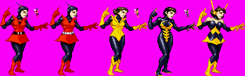 This is one of two scratch-made sprites for a "Captain America and the Avengers" tribute update for ScrollBoss. The first sprite has Wasp in her outfit from the late 80's, the same one she wears in that game in which she appears as a helper in the flying stages. I improved the base sprite in 2012 and made a few more outfits. The version in the Work Progress animation is the 2011 sprite.