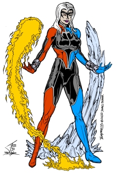 Though she's had about a half-dozen names, many of which I can't remember, Tempress is the second character I made when I was a kid. Yes, the outfit was inspired by the hot and cold knobs of a sink's faucet. Again, I was a kid. She's also had many hair colors and was a brunette until the time I colored this picture. I figure giving her white hair fits in with both the red and blue costume. She may get a more out-there hairstyle later in the stories but this is how she'll look in her early appearances.