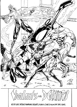 I needed a picture to pad out the 1998 "the Entity" anthology (which had Ace & M-Wave vs. Trick or Treat and the Nutroll: Escapism preview) and didn't want to add another character profile page. It had to be done quickly and there are a lot of the usual signs of me rushing a pic. The main one is how thin Ace looks here. There isn't enough evidence of motion on the guy (who may be Mug, 'cause I can't remember) that Batterram is slamming by his shirt. Just one motion line that gets lost once you shrink it. I didn't blur out Phenomenon's face since he's in energy form and he's my favorite part of this pic. They're fighting D-Gennr-8, a group that was originally called D-Gen-R-X until a worldly-known wrestling federation made a stable with a similar name and I've hated that stable ever since. They were a parody of how characters were starting to look in the 90's which got funnier when an actual group came out that not only dressed like that but had a name close to it (I think you can guess who that is). This was also a preview for the eventual Vigilants comic where D-Gen-R-X would be in the first issue.