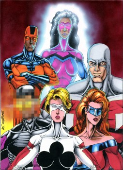 Here's an older picture of my main superhero group, the Vigilants. They were originally "The Protectors" back when I was a kid (After the Jackie Chan flick, I think) but I changed the name once I heard about the Malibu Comics book. The top row features Longway (then called Longfellow), Mindsight, and Batterram. The bottom row features the original 'powered-down' form of Phenomenon, Ace of Clubs and Exponent. This was the 'starting' team line-up as of 1999 and it's how they roll before a big battle brings some other characters into the group. In fact, this is just about how they'll start off in the rewritten version of their stories that'll I'm hoping to do in 2008.