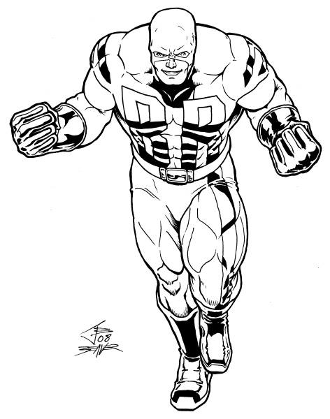 This is a shot of Batterram (or Batter Ram), one of the early heroes I created as a kid. He was originally named Big Red until I realized that I couldn't call him that because of the gum. I hated having to come up with a new name until I was listening to the late Robin Harris' comedy CD where he talked about somebody hopping on a Batter Ram. Not only does it fit his strength level but it worked for the BR that I was used to drawing on the front of his chest. Besides being the muscle of the team, he can become a human battering ram when he reaches a certain running speed which triggers a nearly indestructable force field around his body. This pose is how he runs before crossing his forearms in front of his head to crash through some unfortunate person, place or thing. My only problem with the pic is that I wanted to make him look slighty mischievous but he just looks a bit evil here.