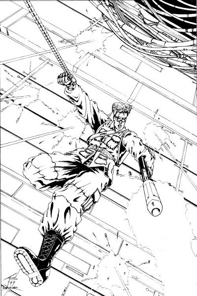 The Bionic Commando, Radd Spencer, swinging and shooting through what I think is the fortress from Area 1 of his NES game. Except for the face, I still like this pic thanks to the detail on the outfit. Having real BDU's (Battle Dress Uniform) to draw the outfit from helped out quite a bit.