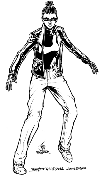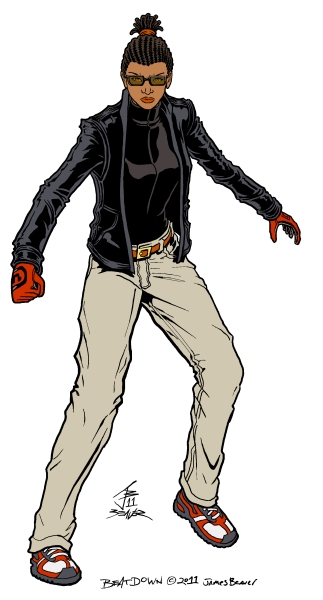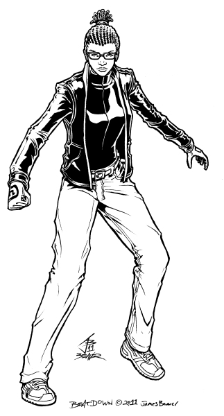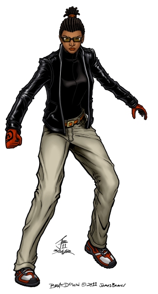 I wasn't happy enough with Beatdown's 2010 picture or design to color it so I drew this on the eigth anniversary of the Illmosis site. Most of the design is still based around her enhanced speed powers but with some story-related tweaks. Bits of a shared origin story I've wanted to tell for years caused me to go ahead and give her that hairstyle as a tribute to one of the in-universe characters who influenced her. She's also wearing bits of the crimefighting outfit she'd have worn if things had turned out differently. I also wanted her to be in a pose that lets you know how much she's ready to run up on someone and lay knuckles on them. I didn't like the first version I drew of this, so I lightbox traced the old version, fixed what I didn't like and changed a few more details to make her look more like the middle ground between two of her teammates. Before coloring it in 2012, I retraced it digitally instead of my usual line cleaning and made it a bit better.