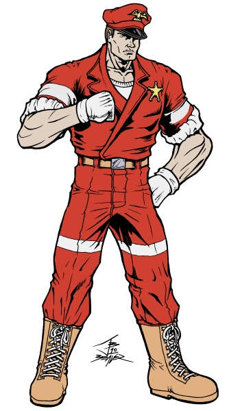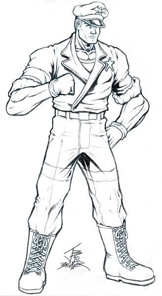 This pic of Douglas Bild is based on his pose seen on the Brawl Brothers (known as Rushing Beat Ran in Japan) and the face is meant to look like his in-game portrait. I planned to draw him last year but lost the notebook that I drew a really good pose of him in. None of the other attempts turned out right so I just redrew this pose of the game's character select screen. The first attempt was drawn in blue line pencils then tightened with regular leads but I didn't like the proportions. I lightbox traced that to new paper while changing the proportions which I still messed up while suffering from the effects of a cold. I digitally shifted a few things here and there (mostly the arms).