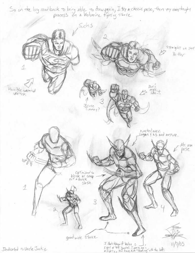 Just sketches of Superman and Wolverine here. These are two of those characters that look horrible if you don't get their sense of posing right. Sure, you can put your own twist on things. But people have known these characters for years and all attempts to sidestep making them look Supermannish or Wolveriny lead straight to faliure. Not that mine are all that great, but that's just what I was working towards.