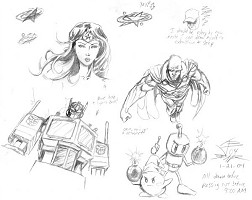 I started by sketching that Ringstar logo and used the rest of the paper for random scribblage. Some people have already seen what that logo's for, but I have no idea when I'm going to put that stuff 'out there' just yet. Don't ask. Anyway, the usual stuff: Optimus Prime, Wonder Woman, etc. I shrunk this down too much, but yes, Bomberman DOES have the detenator there. If you got a tingle in your spine about that then you probably know the joy that is playing Bomberman, especially on the SNES with a multitap. AW YEAH. That Kirby looks like crap, but at least he has a Poppy Bros. power up for some bomb action. This puts me one step closer to drawing that 'Video Game Bomb Stars' pic I've been talking about for half a decade now.