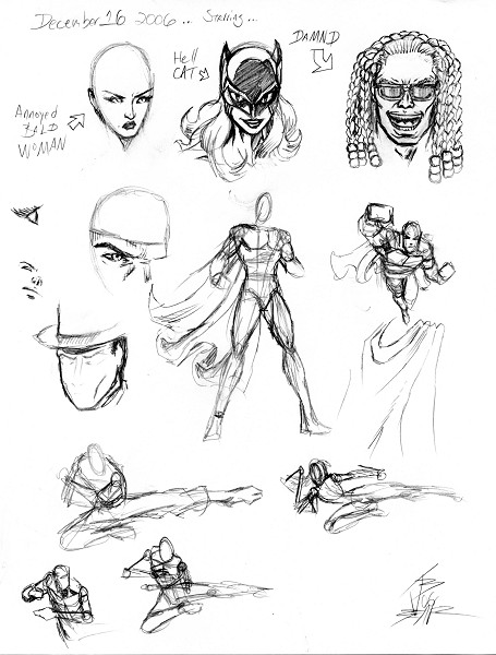 I was going to sleep and wanted to sketch, so all of this happened. Really, the main good thing to come of it was drawing Hellcat. I still can't draw a version of Damnd's face that I like. Then again, I was half-asleep. Those jumpkicks down there at the bottom? I'll be using at least one of those poses for a character of mine.