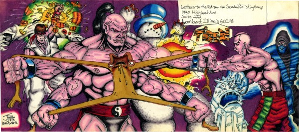 Clay Fighter was born in the post Street Fighter boom of 2-D fighting games. The name isn't a joke as the creators used clay and stop-motion animation to create the fighters. Nearly every advertisement for the game featured one of the characters gloated over broken, defeated parodies of Street Fighter and Mortal Kombat characters. So this envelope was an answer to those ads because... come on, man. SF and MK would whoop that butt and you know it. This was inked with Koh-i-noor Rapidograph pens (I'm guessing the .25 mostly), colored with Berol Prismacolor markers and white highlights done with the another Rapidograph filled with white ink. The colors have kinda messed up with age. I have no idea why I didn't send this one in.