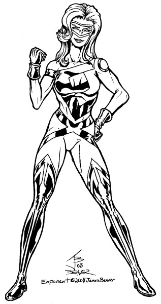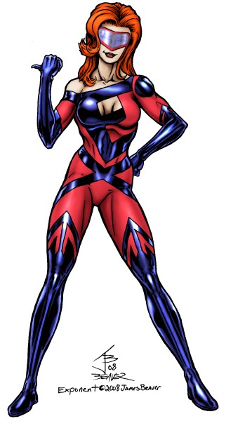 This is Exponent, one of my oldest characters who clocked into existance at around 1987 or so. I could never think of a good outfit for her until the late 90's when she first got an outfit that looked much like this one. Since then I've only made minor tweaks and this picture here has a few recent ones. I changed the gloves since they were too similar to the ones her fellow Vigilant member Ace of Clubs wears. Then again, she'll be one of those heroines who loves costume changes and her friendship with designer Passion Tanaka will give her access to more (and free) outfits. She still has letters of her name mixed in with her outfit's design to make her look a bit more old-schoolian but her boot and glove tops have the whatever-grade random patterns of more modern outfits.