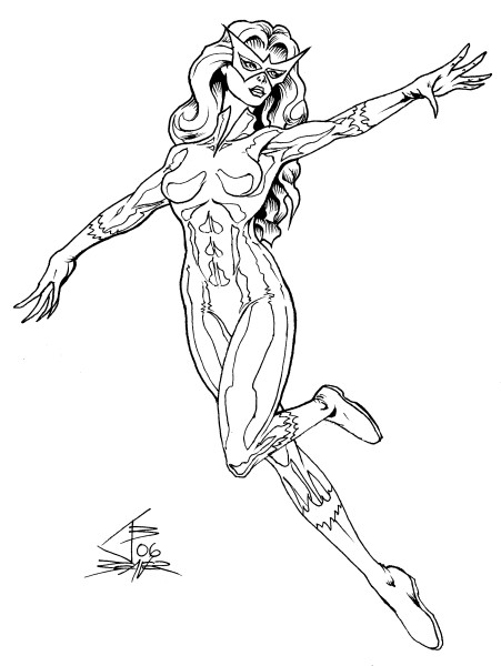 After a week of not being able to draw (due to my zombie-like state of sleep deprivation), I sketched out this pose Friday night. I wasn't sure who it was going to be, but I just felt like drawing it. If it weren't for the fact that I had drawn the left leg bent up like that, this would've been Mera (Aquaman's red-haired wife) swimming. Other choices were Star Sapphire (too 'nice' of a pose) and Firebird (from Marvel). I ended up making it into Firestar because I keep catching 'Spider-Man and his Amazing Friends' on ABCFamily. So, I decided to make this picture into 'Miss Angelica Jinx' and finally have a piece of solo Firestar artwork on the site.