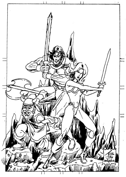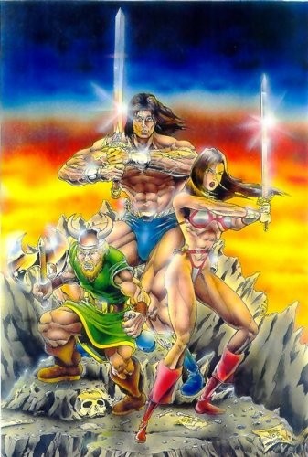 To diversify my portfolio with a sword and sorcery piece, I also decided to pay tribute to one of my all-time favorite games by drawing the heroes of Golden Axe. They are (L to R): Gilius Thunderhead, Ax Battler and Tyris Flare. I don't think you can see it at this size, but one of those thieving little elves that take the magic bottles in the game can be seen hiding in this picture. I hate those lil' thieves!