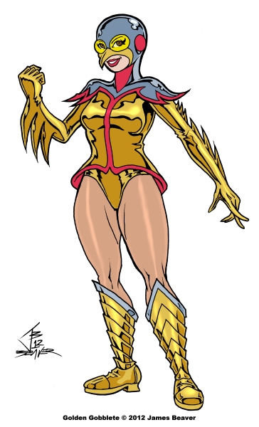 "She was working in a huge chain store during a terrible Black Friday when the crowd of shoppers start fighting each other and attacking the workers. Telling a co-worker that she'd found another box of padlocks, she was suddenly attacked by shoppers who thought she was depriving them of a new assortment of discounted laptops. She was chased to the grocery department and nearly beaten to unconsciousness until she was saved by the giant plastic turkey display that fell on her attackers. Taking this as an omen, she became a costumed vigilante who does her best to protect store workers and innocent shoppers from the unruly mob of crazed bargain hunters. Gobblette has developed an aisle-tested form of martial arts which turns the entire store into a weapon to defeat her foes. Even the most stone-cold soccer mom emboldened with an inflated sense of sales floor entitlement now knows to push her cart a bit more softly, for you never know which store the Gobblette has decided to stalk."