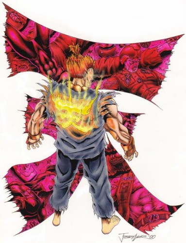 He's called Akuma in the U.S., but he's known as Gouki (which is his real name) in Japan. As you can see, he just finished wiping the floor with a lot of people stupid enough to get in his way. Is everything in here accurate? Nope. That's because I drew this before two things: one, I knew of Tiamat's FAQ and before I had even been on the internet. Funny thing about Street Fighter games (and most fighting games in general) is that most of the really important information is to be found everywhere except for the game. No, that symbol doesn't appear as flame on his back, but I thought that it looked cooler back then. Plus, I needed something to airbrush or it'd look lazy. This is one of those pics that I'm really thinking of redrawing someday.