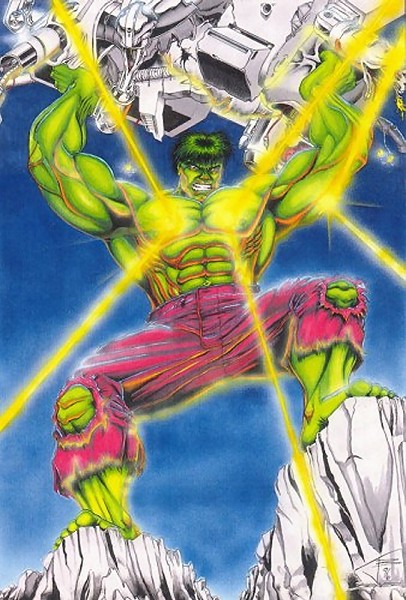 A lot of people that look through my artwork folder now still like this one. There's just this certain way that the savage version of the Hulk's face should be drawn, in my opinion. You can't just give the Hulk the same face that every other big character has. I think it's based on the Sal and John Buscema way of drawing him that's stuck with me. I think I made him a bit too ripped, but I got close to the 'thick trunk" shape that I wanted him to be in. Monsters shouldn't look like they use ab machines 'that target the obliques' and all that crap. Next time, nothing but thick, chunky monster Hulk. BTW: the junk he's holding is just junk, except for some definite robot parts. Otherwise, it's just a big mess. Probably didn't even hide a Wu-Tang symbol in there or anything.