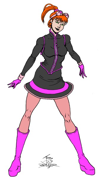 Inkwelle (formerly Celirella) Her real name is Susan Janet Weaver. I wanted to make her look fit without giving her an amazon/superheroine look. I think I got it right, but I'm not sure. I was going to throw a bit of green in the color scheme, but went with pink instead. Besides, purple + green = evil about 87% of the time.