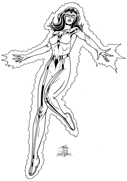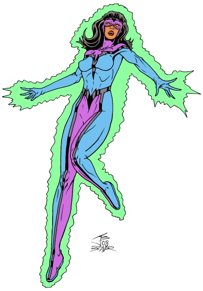 Here's my character Mindsight in her almost-finalized new outfit. This design pulls from two slightly different redesigns I did in 2007. As much as I try to use thinner, static poses for the character profiles, this pose forced itself out of my head. She's using her telekinesis powers to hover. Having the TK aura react to her hand jive positioning was a spur of the moment idea that I think I'll keep using with her. I tried to draw her with a more realistic build to fit with her character and powers. I was originally going to have her aura be green but I switched it back to pink and purple since that's usually a sign of mental powers.