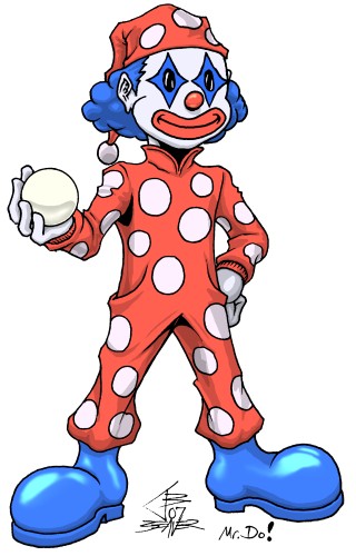 If you haunted video game arcades back in the early 80's, had a Colecovision, or just love classic video games, then you're probably saying 'I can't believe somebody drew Mr.-freakin'-Do!" If you think that Playstation 1 games are old-school, you may need some backstory here. Mr. Do is a clown who is armed with an amazing, magic throwing ball that can ricochet off walls until finding and disintegrating it's target and regenerating in Mr. Do's hand seconds later. He fights dinosaurs, unicorns and letters of the alphabet in places like farms, castles and amusement parks. There. Now it should all make perfect sense.