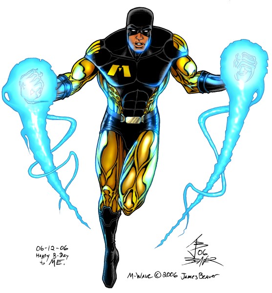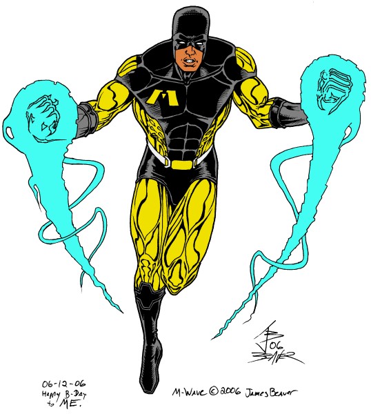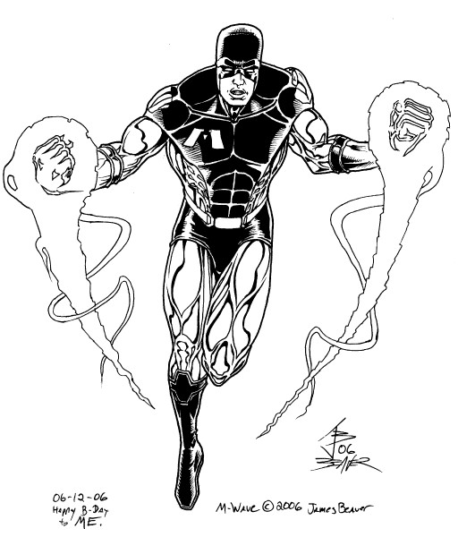 M-Wave here was the first character that I made over 20 years ago. This picture features another modified costume for him that I'll probably stick with for his stories. This was redesigning the outfit as I drew it which caused some things to look uneven. I got the B-&-W version finished on my birthday. In Feb 2007, I made some corrections with his left arm and laid down the flat colors. I went back again in May to do some more fixes and finally finished the coloring. This turned out much better than I thought it would. In the 'Random info that I'm placing here until I make the character's profile' dept., his outfit is black and gold because those are the colors of the local high school here.