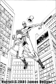This obvious homage to the cover of Amazing Fantasy no. 15 (drawn by Steve Ditko) was going to be the front cover to a mini-comic that I planned but never did. The idea was that the front cover would've had the homage to a certain web-slinger while the back cover would've had a second parody of another character's first appearance. Seeing as how I still may draw that, why bother to tell you?