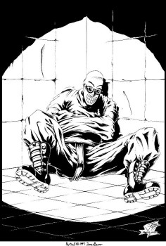 There were quite a few picture that caused interest in Nutroll and this was one of the first. It's purposefully drawn so that you can't tell if the jacket arms are locked together or not. You can look at the mask and tell how his design was still in transition. Though not intentional, I'm pretty danged sure the visual inspiration is from David Bowie's 'Ashes to Ashes' video with a pretty similar scene. Years after drawing this, I caught the video on MTV2 back when the channel was worth a damn, saw the scene and KNEW that's where that was from. It became page two of the old Nutroll preview story that's now called 'Escapism' and a similar page will be in the remake I have planned for this 2007.