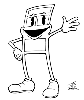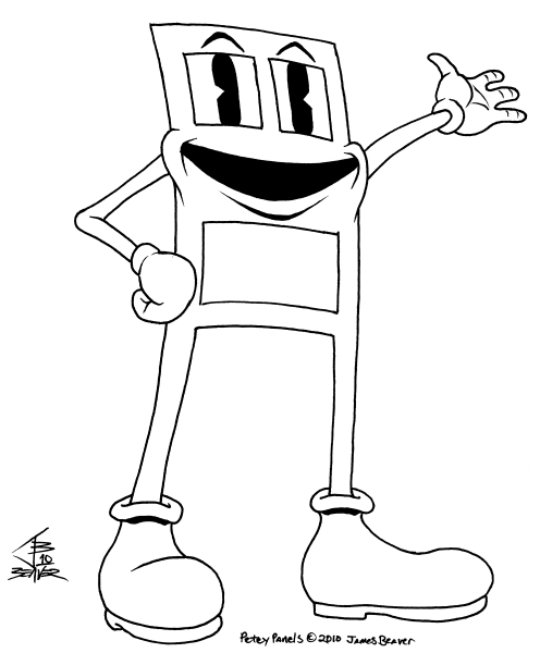 Hey, it's Petey Panels? Wait, who is he? You'll find out in mid-2011! What is he? He's a comic page anthropomorphized like an old cartoon. Why is he? Mid-2011 for that! Where is he? That's a good question. Guess when I'll answer it? RIGHT. I posted a preview of him in October 2010 but it was a different version with a design I didn't like. I made a few tweaks and redrew him on New Year's Eve and liked the results MUCH better. That little section at the top makes him look a lot better (in my opinion) and will make a few more panel-related sight-gags possible.