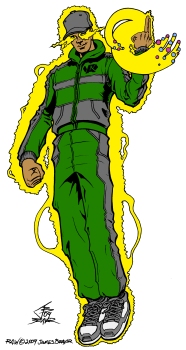 Raw is one of my early 1990's characters and here he is in tracksuit style outfit. The outfit is slightly based on his old traditional-style superhero outfit although that had a cap,too. Raw has always been my main character to throw out Hip-Hop references and thinking about how his powers work lead to a visual reference to one of the greatest Hip-Hop albums of all time. Seeing as how I played the cassette so much that I wore the printing off of the tape back when it first came out, it's ridiculous that it took me this long to think of that. Better late than never.