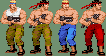 The first two sprites of Bill and Lance from Contra are based on the poses from the classic NES box art. Despite the fact that the two characters' designs are loosely based on Arnold Schwarzenegger (Bill) and Sylvester Stallone (Lance), both poses were based on stills of Arnold from the Predator film. The sprites's uniforms are based on the in-game sprites from the arcade version and the NES sprites (even though Bill has black hair in it due to graphic limitations of the system).