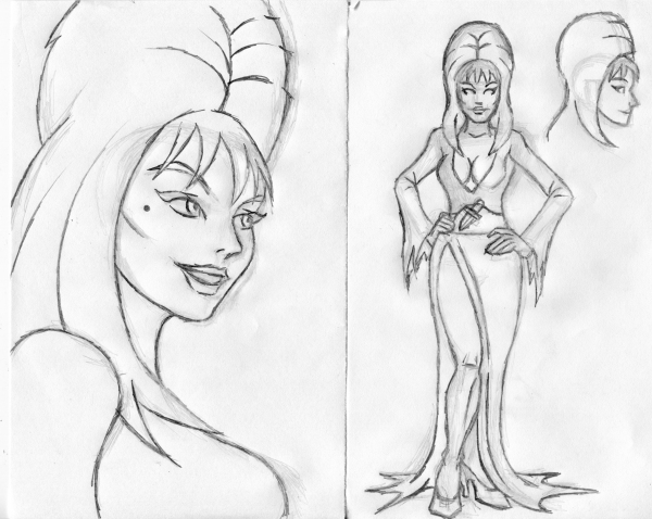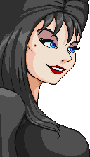 2014: The first sprites and portrait were made for the first DangerTerrorHorrorThon horror and monster-themed update of ScrollBoss in 2014. The main Elvira pose was based on a reference pic that I found a while ago, but can't find online now. I partially tried to match the Street Fighter Alpha 3 Vs. portrait style (mainly the face positioning, head shape and nose) while trying to still make it look a bit like Elvira. I tried to work in the smirk from on a site wallpaper here. I was trying to make her look sly and smart, but she wound up looking more cute than I intended. Honestly, Elvira is as fun to draw and sprite as she is to watch in hosting duties or in her own movies, so don't be surprised if I add more to this.