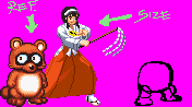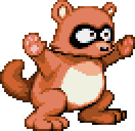 This is Rocky from the Pock & Rocky series on the SNES. Rocky, originally known as Manuke in the original Kiki Kaikai series in Japan, was actually the final boss who Pocky (a.k.a. Sayo-Chan) had to defeat in the original Kiki Kaikai arcade game. I based his look on the image used in the character select/player start screen from the first Super Nintendo/Super Famicom game by Natsume. His size is based on a Sayo-Chan sprite edit I made using CvS sprites. The first version of this that I had on ScrollBoss didn't have enough of a gut and this is the next-to-last frame you'll see on the progress animation I've linked to down there.