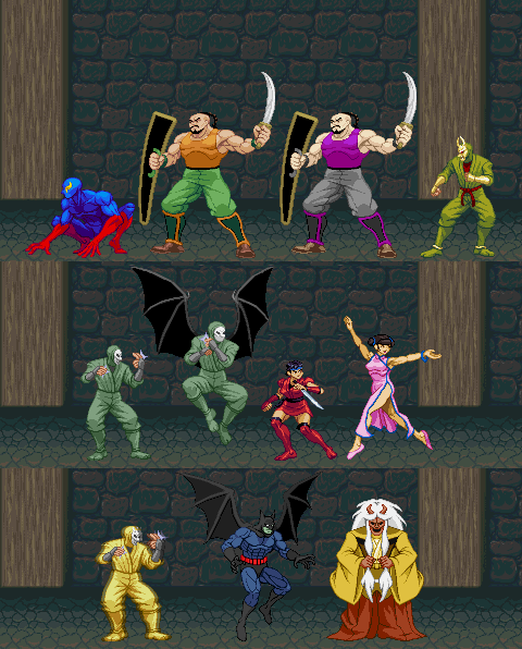 Nakohara (the final boss from Shinobi) and the low-level ninja from Revenge of Shinobi were made at the same time as the Shinobi 1 Joe sprite. The Revenge of Shinobi Bat-doppelganger sprite, based on a boss removed from the later revisions of game (too legally dangerous), was sprited in 2014 when comic fandom decided that celebrating Batman's 75th once just wasn't enough, as if Batman doesn't get enough attention.