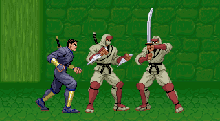 When I first sprited Joe Musashi from scratch in 2012, it was in his original uniform from the Shinobi arcade game and I tried (but failed) to make his face look a bit like Sonny Chiba (the Revenge of Shinobi/the Super Shinobi title screen is based on a pic of him as Hanzo Hattori). The results weren't as Chiba-like as I'd hoped, but it keeps him from looking generic. I finally sprited him in his Revenge of Shinobi look in 2014 to celebrate that specific game's 25th anniversary).