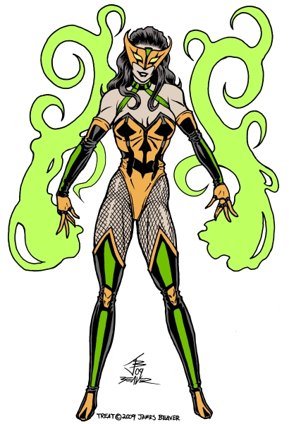 Treat, from my oddball villainous duo known as Trick or Treat, is here in her 2007 redesign that I didn't get around to drawing until 2009. Her redesign wasn't as drastic as Trick's but her costume wasn't as horrible. She kept many of the old elements like the pointy eyepiece mask, fishnets, tall boots and such. Treat and Trick now share a closer design with her outfit getting the pumpkiny goodness that the old costume lacked. I think the new eye lenses make her look a lot more intimidating and freaky.