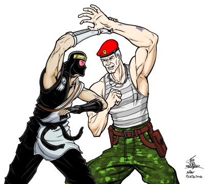 This was a commissioned piece with my character, Twofold, fighting with Field Captain General Kozhezub, a character created by GraphiteSTALKER (whose deviantART profile can be found here). The requested pose is based on a picture by HappyHarry for a Kung Tai Ted review. I'm not used to coloring in this style unless I'm using markers, and I honestly think that using markers is easier. You can probably tell that I had fun drawing Kozhezub's face, as I tried to give him a grizzled look that I rarely get to draw. I may try some grayscale marker/computer coloring techniques if I ever have to color like this again.