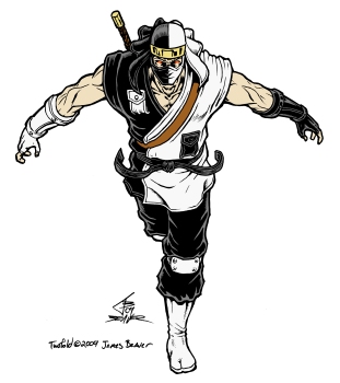 This has been Twofold's running style since the early 90's. It's that classic fictional ninja run where they have Smooth Criminal lean forward with a 45 degree angle. Kenji does it slightly differently in that he has his arms outward and angled back as if he's both trying to be more aerodynamic and look like he's not trying to block incoming attacks. I drew this pose a few years back but I needed a better one in his current outfit with the new armguards. I was tired when I drew this and almost fell alseep before the inking was finished. Luckily this is one of my favorite Twofold poses and the fun of drawing it again kept me awake.