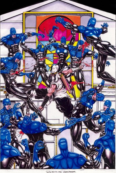 This was originally a pin-up page I did of him fighting the Night Rain clan, a group of characters that I can't really describe just yet. They'll have a redone origin for the new series, but they'll operate much like they do here. By that, I mean try to take on Kenji all at once only to get sent to the Hell of Being Cut to Pieces. One of the only reasons that I bother to show this is to prove how long I've had an obsession with drawing one hero returning lots of opponents to the dust at the same time. For people that knew me, it became sort of an inside joke of how many people I could draw Twofold cutting at the same time. This was probably my record, but I could be wrong.