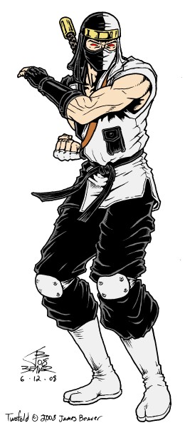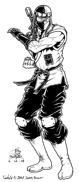 Here's Kenji Toshida (a.k.a. Twofold) in a slightly defensive stance similar to something that you'll see in his comic. I pencilled this after my original computer went down and inked it on my birthday. I'm not 100% happy with how it turned out, but I do like the new forearm guards on his outfit. I'll miss the detail of drawing the arm wraps, but I've had this really nagging thought about how they'd slow him down if he had an immediate need to pu the outfit on. Plus, they make him look more modern and add balance with the kneepads. I redrew the masked and unmasked heads a few times.
