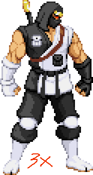 A few people, especially this guy, have asked me when I was going to get around to making sprites of my characters. The problem is that I've tried but the results were horrible. The problem is that my early sprites of my characters look like shrunken version of my artwork, but even crappier than normal. Since I'm the main person that draw Twofold, I can only imagine him as I draw him and he's normally a bit less bulky than this sprite is. One of the reasons that I kept editing pre-existing sprites for so long was to build an automatic sense of the more dynamic proportions that you'd see mostly in the Capcom games, my personal favorites. Doing that seems to have paid off because this is the first Twofold sprite that I'm not too ashamed to show people. There will be more sprites of him in more dynamic poses but I needed this one to use as a guide for how to make the rest of his sprites. Things still need a bit of work but it still feels good to finally do this.