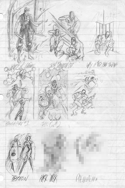 I have tons of little sketch pages here and there of things that I planned to fully draw. I found this one while looking for old Twofold material and was shocked to find one page with that much decent stuff on it with two ideas being made into full pictures. The Twofold pic here was titled "Winds of Change" because I wanted one pic of him for each of the 5 elements. "Just Hangin' Out" was probably named for the Main Source song and has Sean Chan, Amy Mao and Gordon Wu from the Twofold comic. The Nutroll sketch went on to be a pin-up that was turned into Nutroll:the Illness page 2. The following two sketches cover ideas for the ashcan with the Entity, M-Wave and Ace of Clubs but the final version adds Nutroll since a preview of "Escapism" was added to the book. You can barely make out the 6th pic but it's of my supergroup, the Vigilants. The pic in the lower left corner is a picture of Passion Tanaka that should've been drawn as a big picture. In fact, I think I'll make that happen soon. Hard 'Nock (as he was known then) and Phenomenon had pics here that got the mosaic treatement since they're not supposed to be unmasked yet. That Hard Knock pic will probably get drawn, too.