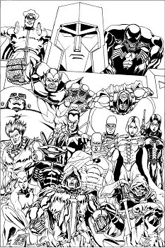 So after making the favorite heroes pic, people wanted me to make one with my favorite villains. Okay, I wanted it, too, but other people wanting it made me want it more. Here's the problem: some people wanted me to draw my favorite villains while others wanted me to draw the exact counterparts to the heroes in the first pic. Those two things don't overlap perfectly. It worked in a few cases like Megatron, Venom, Sinestro, Reverse-Flash and Cheetah. People thought that Venom and Magneto shouldn't have been in the pic because they weren't considered villains at the time, but I liked them as villains. Oddly enough, quite a few of the characters here (Juggernaut, White Queen Emma Frost and the Taskmaster) are currently flip-flopping between villain and hero status. It was never colored because I couldn't airbrush anything where I was living at that point and I haven't been able to since. But I may be able to here. It's all for the best because I plan to do all-new group shots in 2007. If my computer can handle it, that one will be in color.