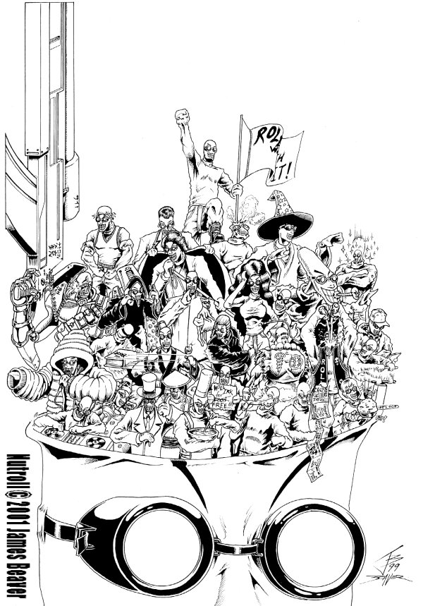 | During High School, I was constantly making up new characters at a rate that'd average to at least one a day. While some of the characters are still worthwhile, most were examples of creatively throwing "stuff at the wall to see what sticks". One of the worst examples of this was when I was sketching out some characters while waiting for German class to start. I was playing with the idea of some strange mercenary/military group. Hey, it was 1990 and the concept wasn't totally ran into the ground like it is now. They looked like G.I.JOE-styled characters, but the more crazy ones (think 'Creature Commandos' from DC Comics mixed with something stupid). The last one that I made was supposed to be the group's resident psychotic character. I gave him a crazy smiley-face mask with some strange goggles. I was looking at him thinking that this is probably the most bugged-out comic character that I'd done up to that point. I named him Nutroll after one of the funniest things I had seen up to that point: a Robert Townsend HBO special called "Playing the Nutroll" (part of his great Partners in Crime comedy/variety show). |