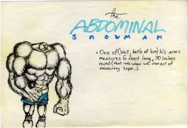 the Abdominal Snowman Here's one of those Bug-Out characters I was talking about. He actually goes back to about 1988. I though it'd be funny to have an overly muscled character with a chick pea-sized head before serious comics started doing it in the 1990's. The main reason I posted this is because it took me a while after designing the Ice Cream to realize that I mostly drew them with the same proportions. |